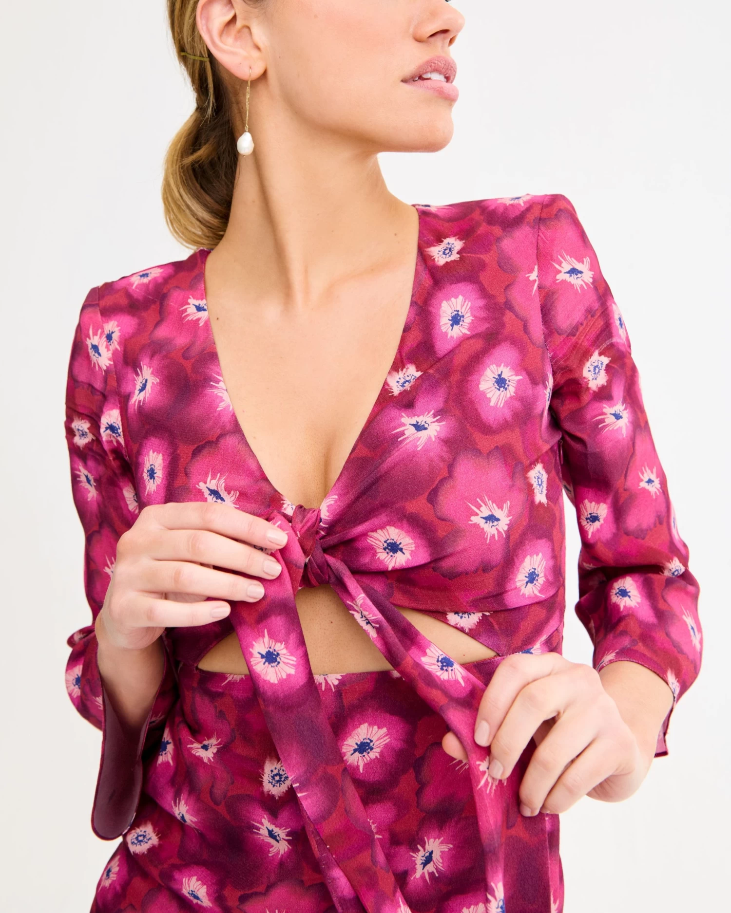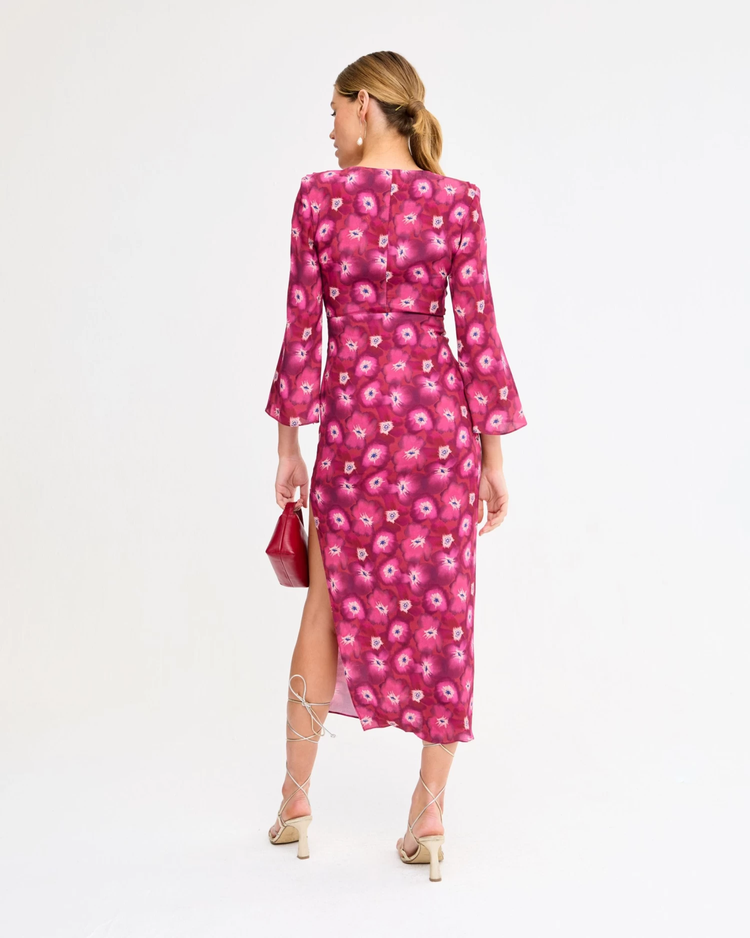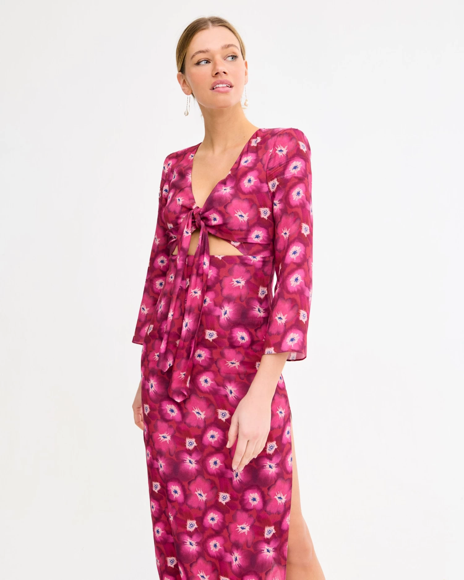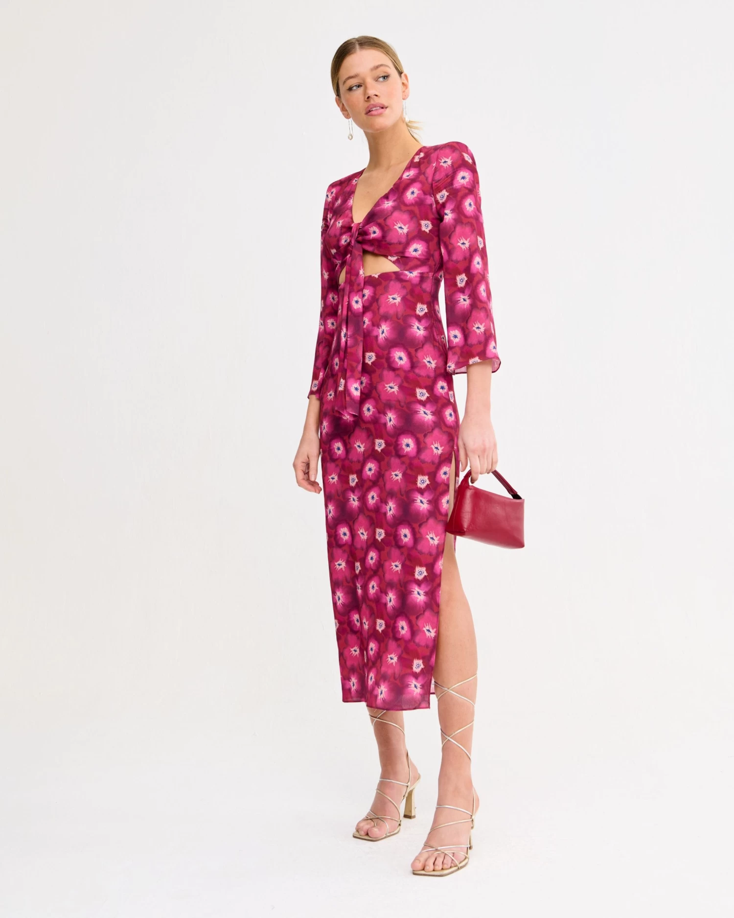 Vestido midi con escote en pico con cut out, detalle de nudo en el pecho y abertura lateral.