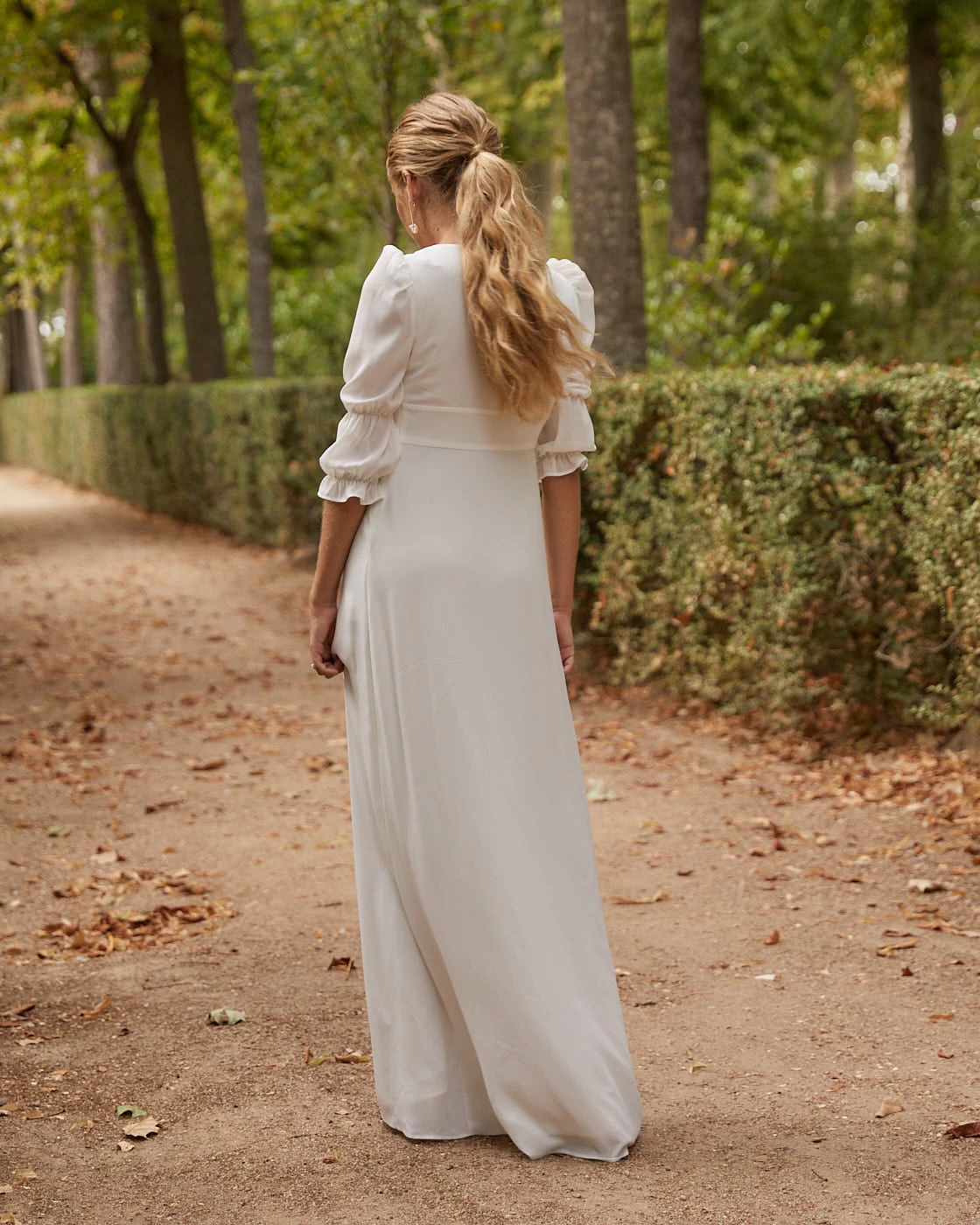 Vestido largo de corte evasé con escote en pico, mangas abullonadas y botones en el mismo tono de adorno.