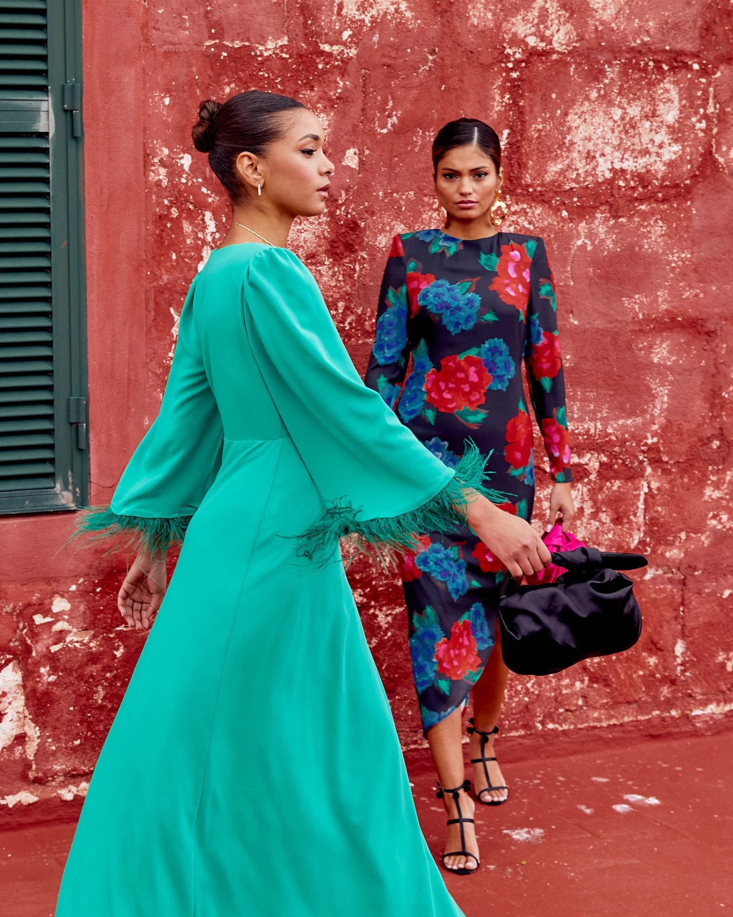 Vestido midi de corte evasé con abertura delantera, escote en pico y detalle de plumas a tono en las mangas.