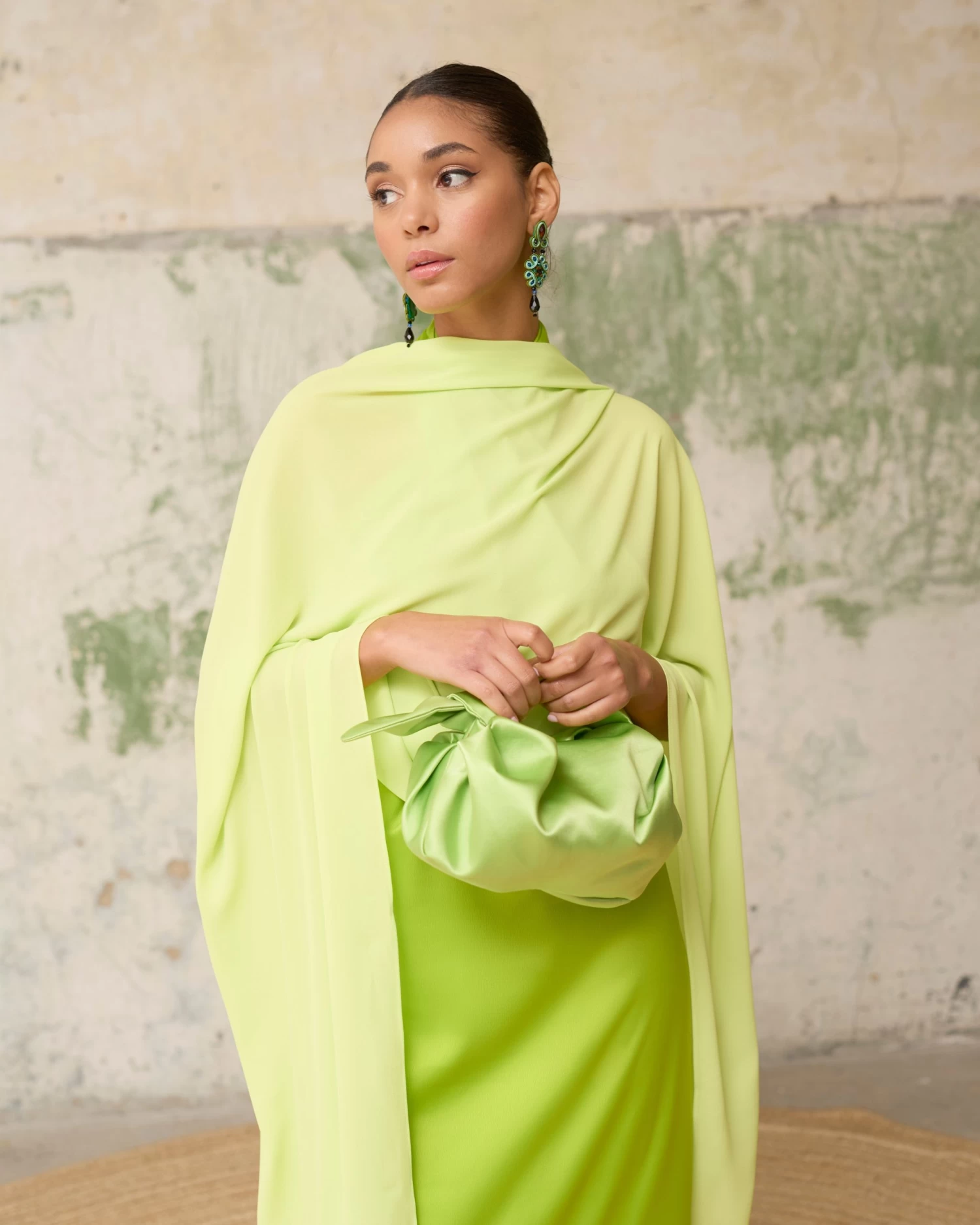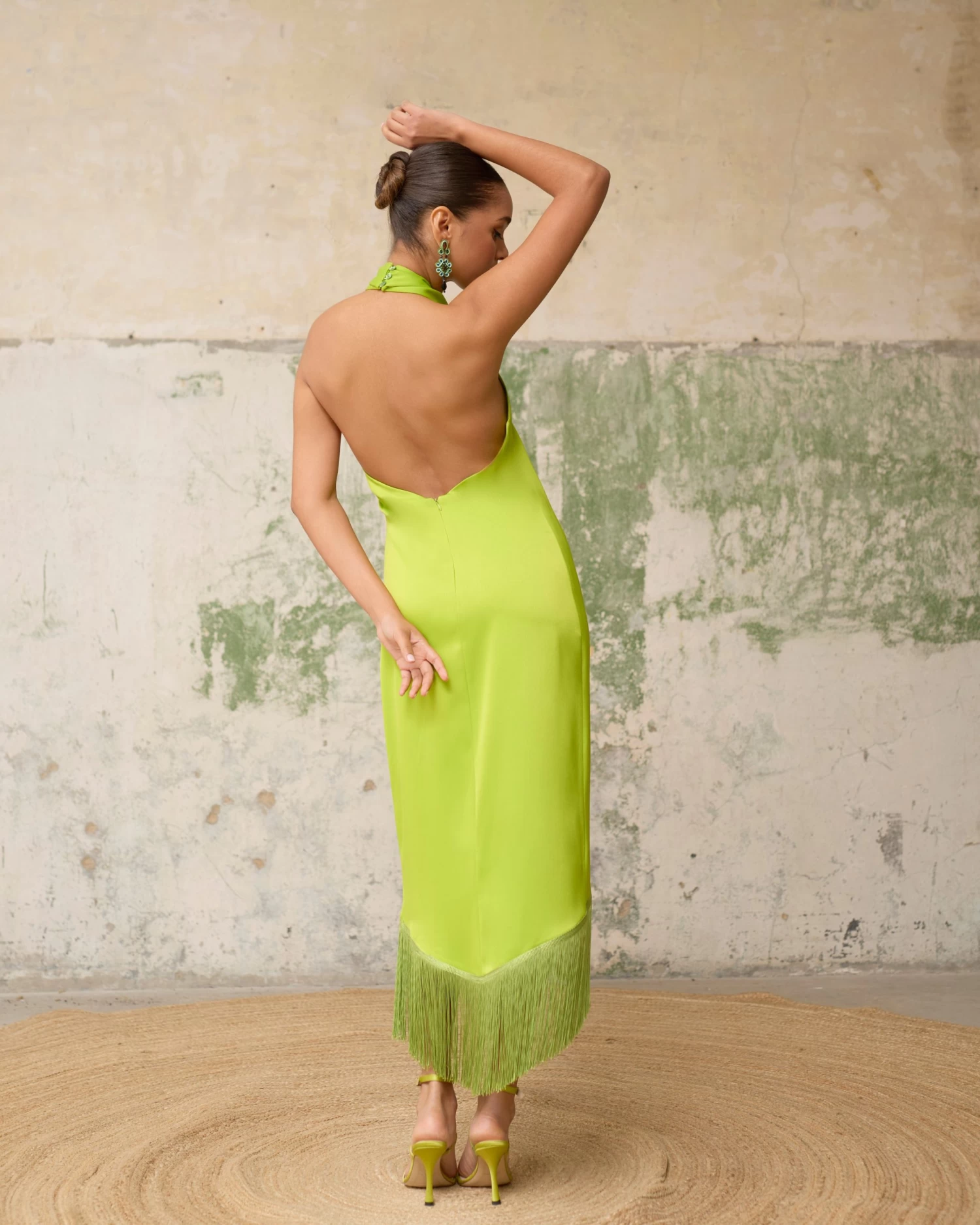 Vestido midi con escote halter cruzado, espalda descubierta en forma de V y bajo con flecos al tono que le dan movimiento al vestido. Cierre con cremallera en la parte trasera.