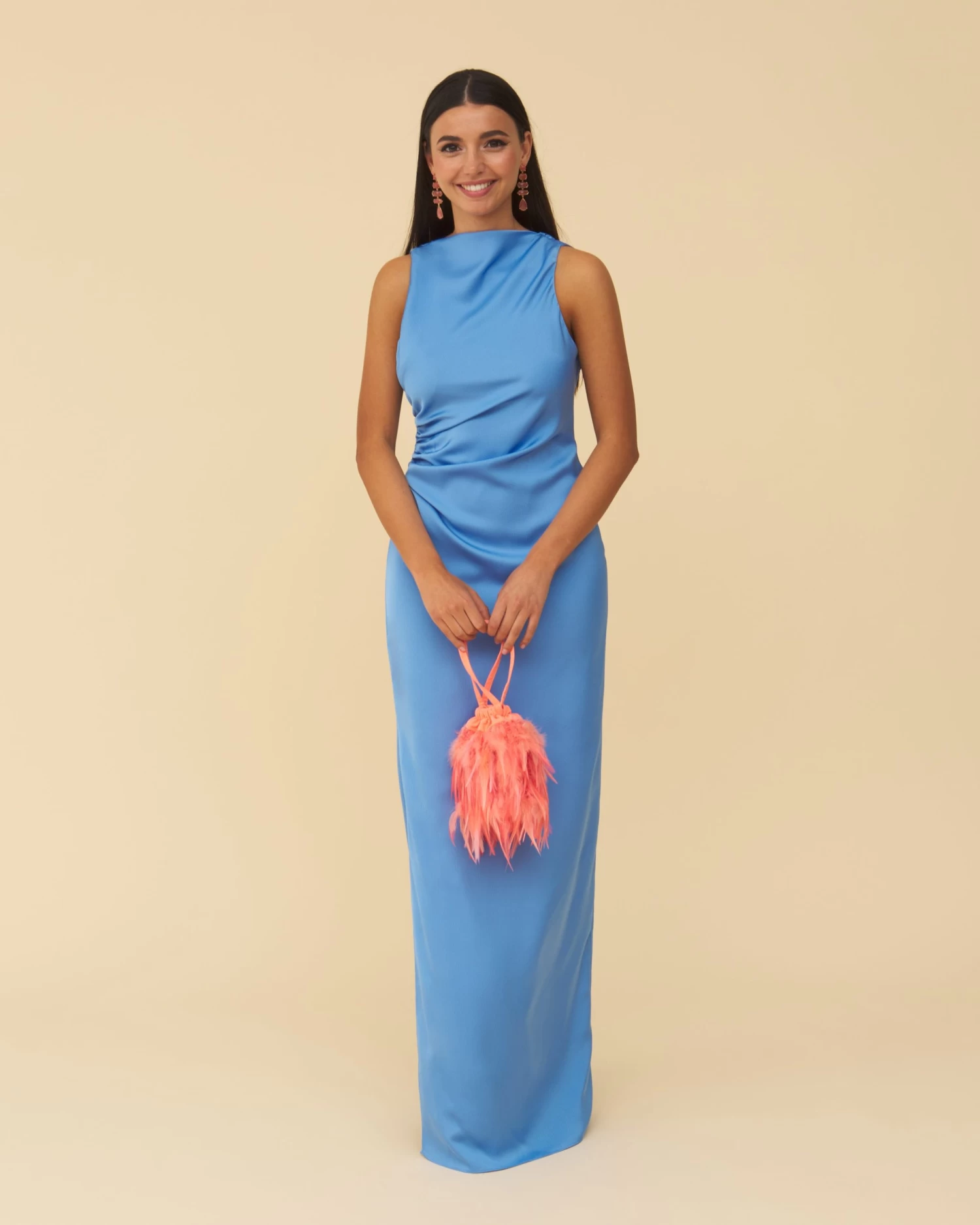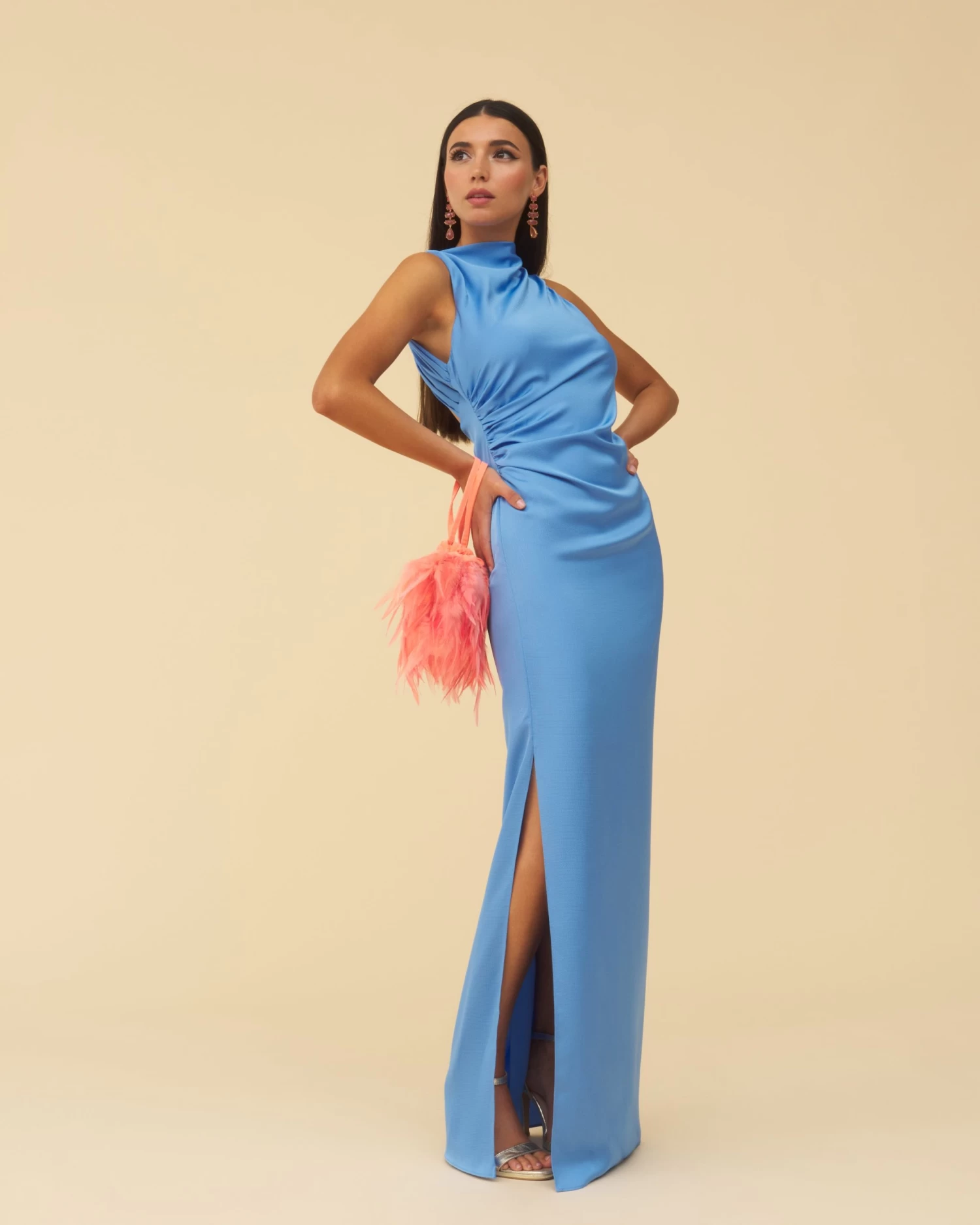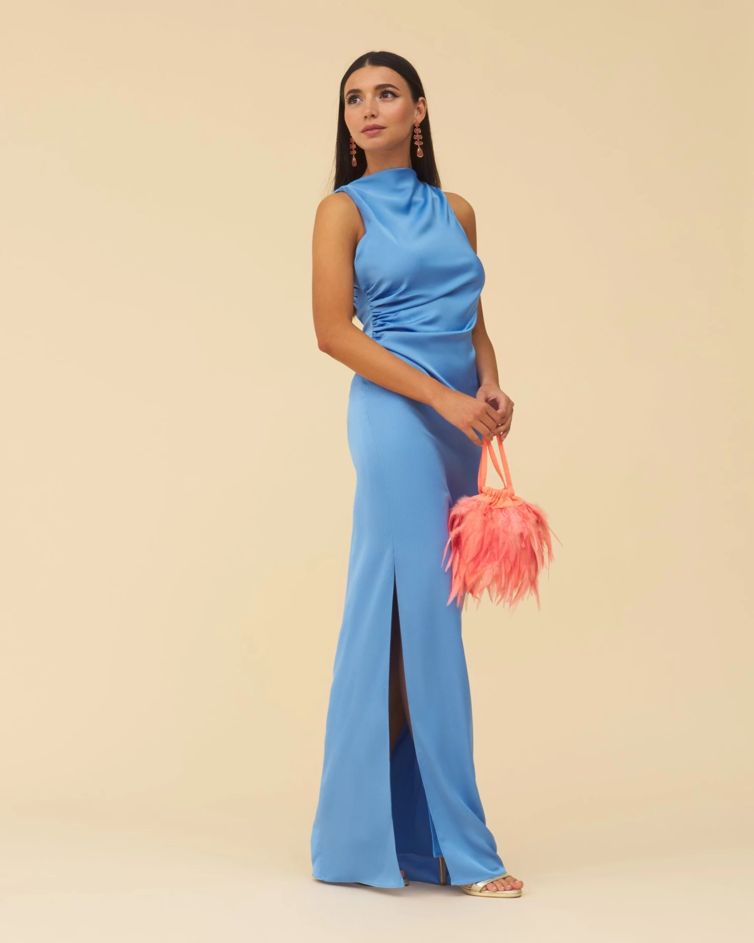 Vestido largo con frunces en la parte delantera, abertura en el lateral y escote en la espalda.