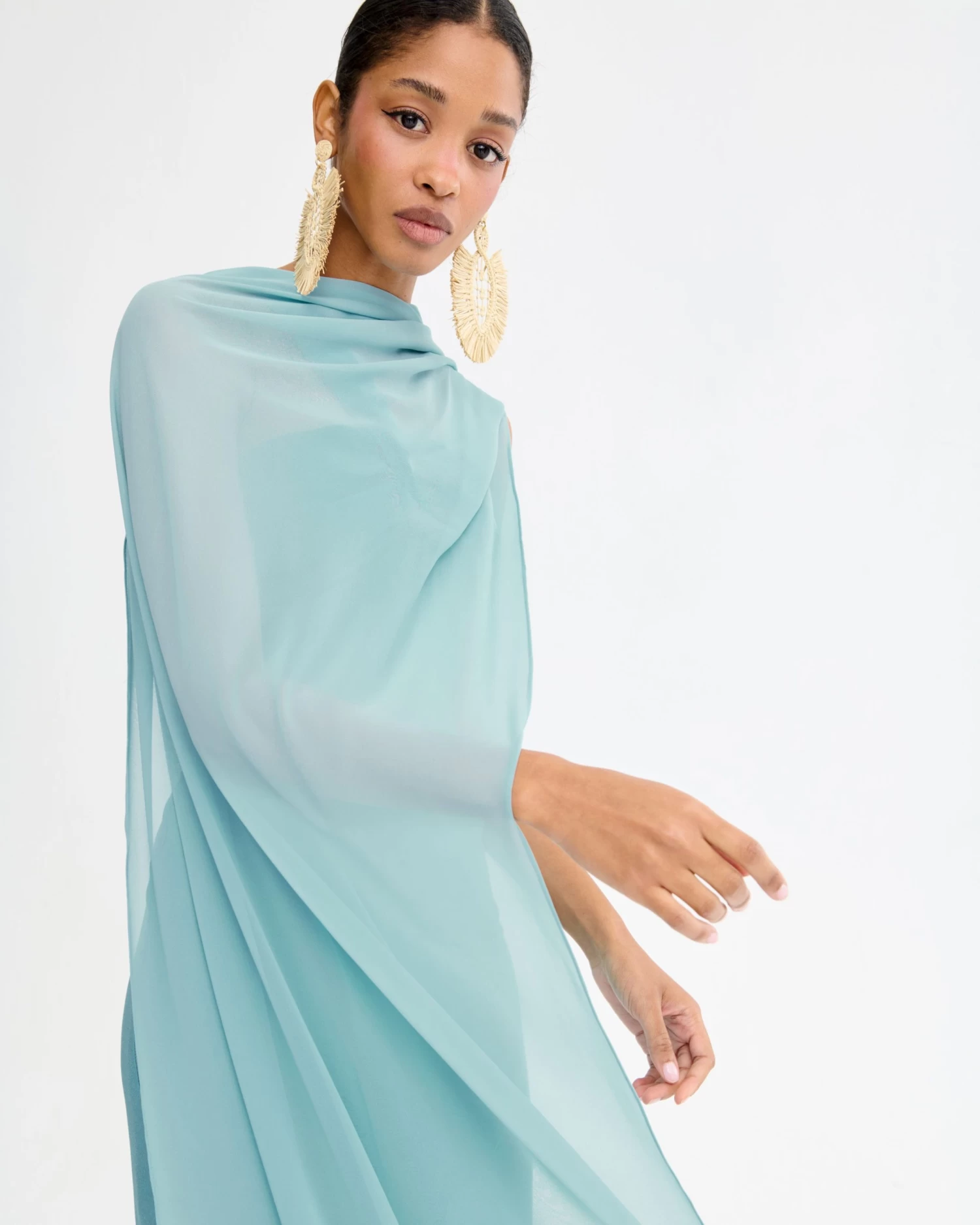 Vestido midi con cuello halter y corte asimétrico en la falda con ligero volante para darle movimiento.
