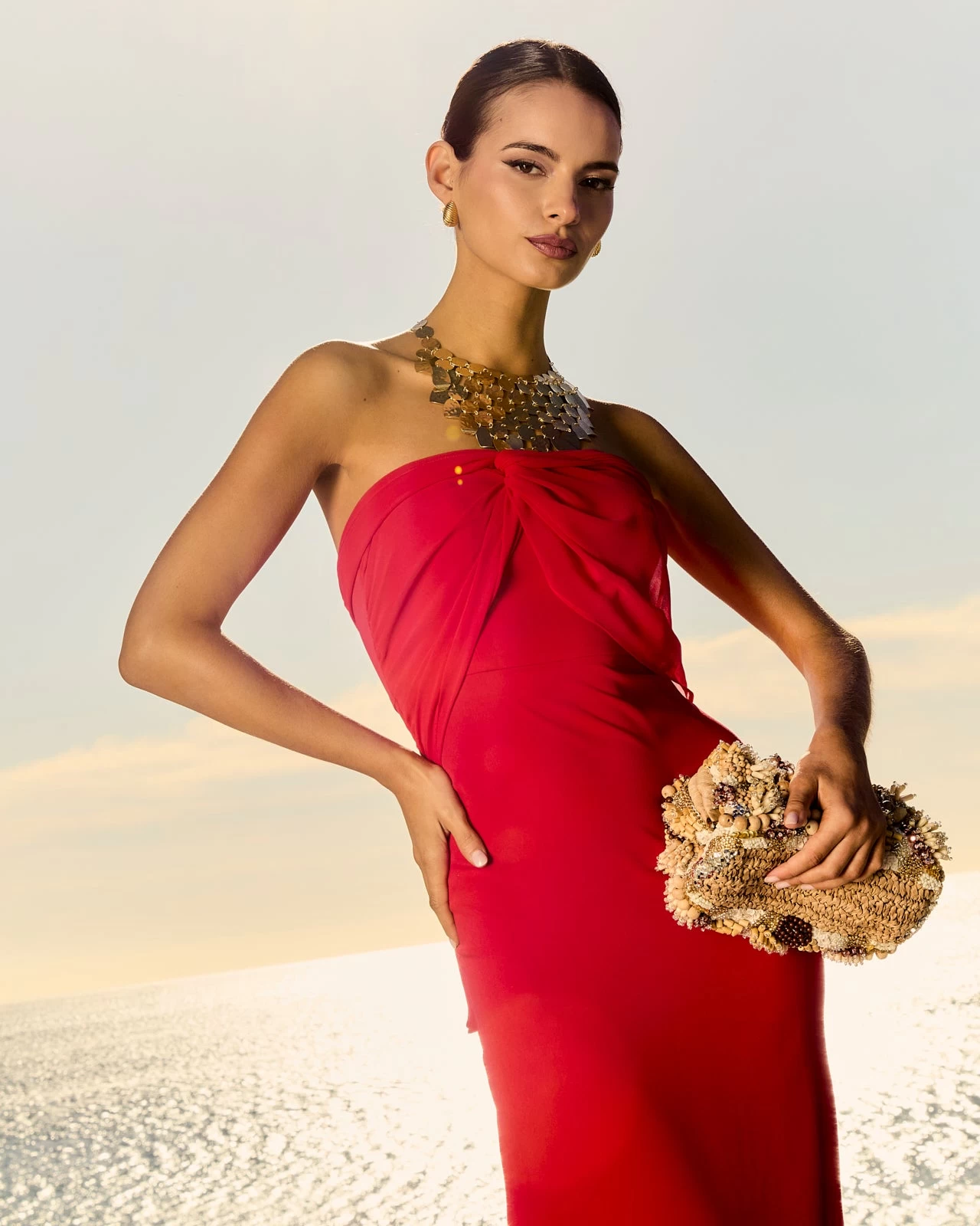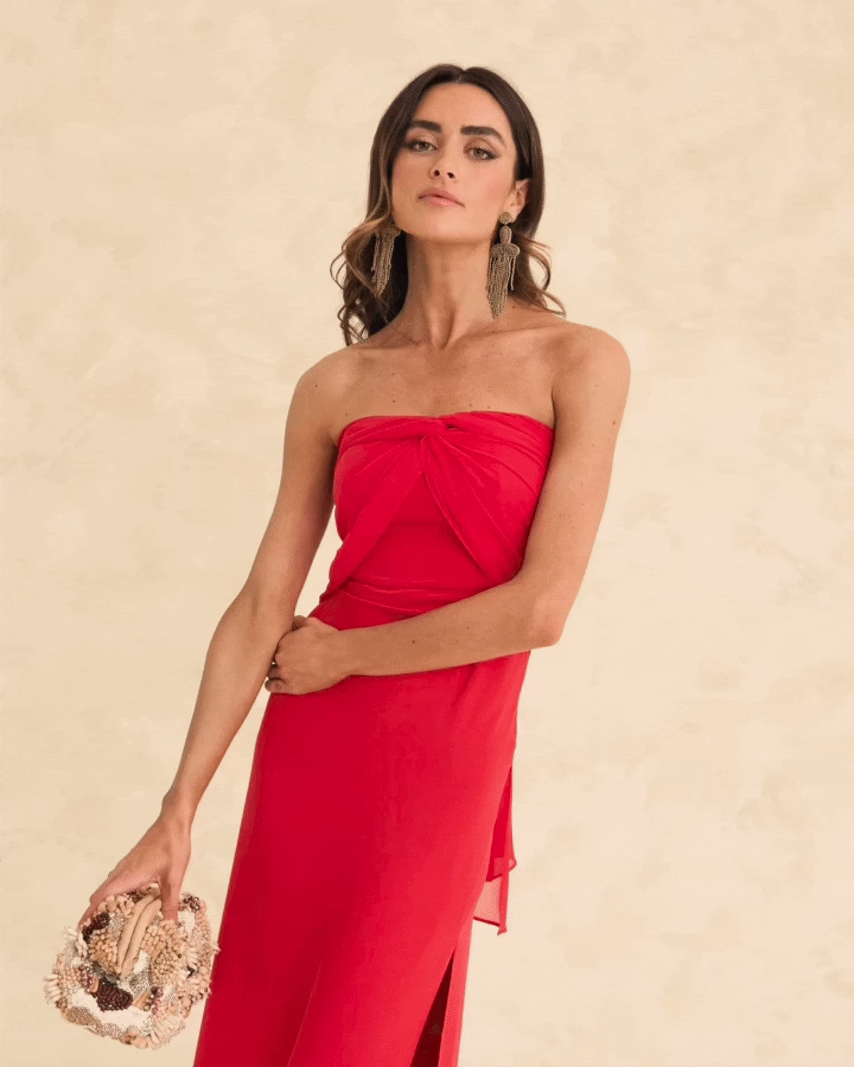 Vestido largo con escote palabra de honor, chal multiposición y abertura lateral.