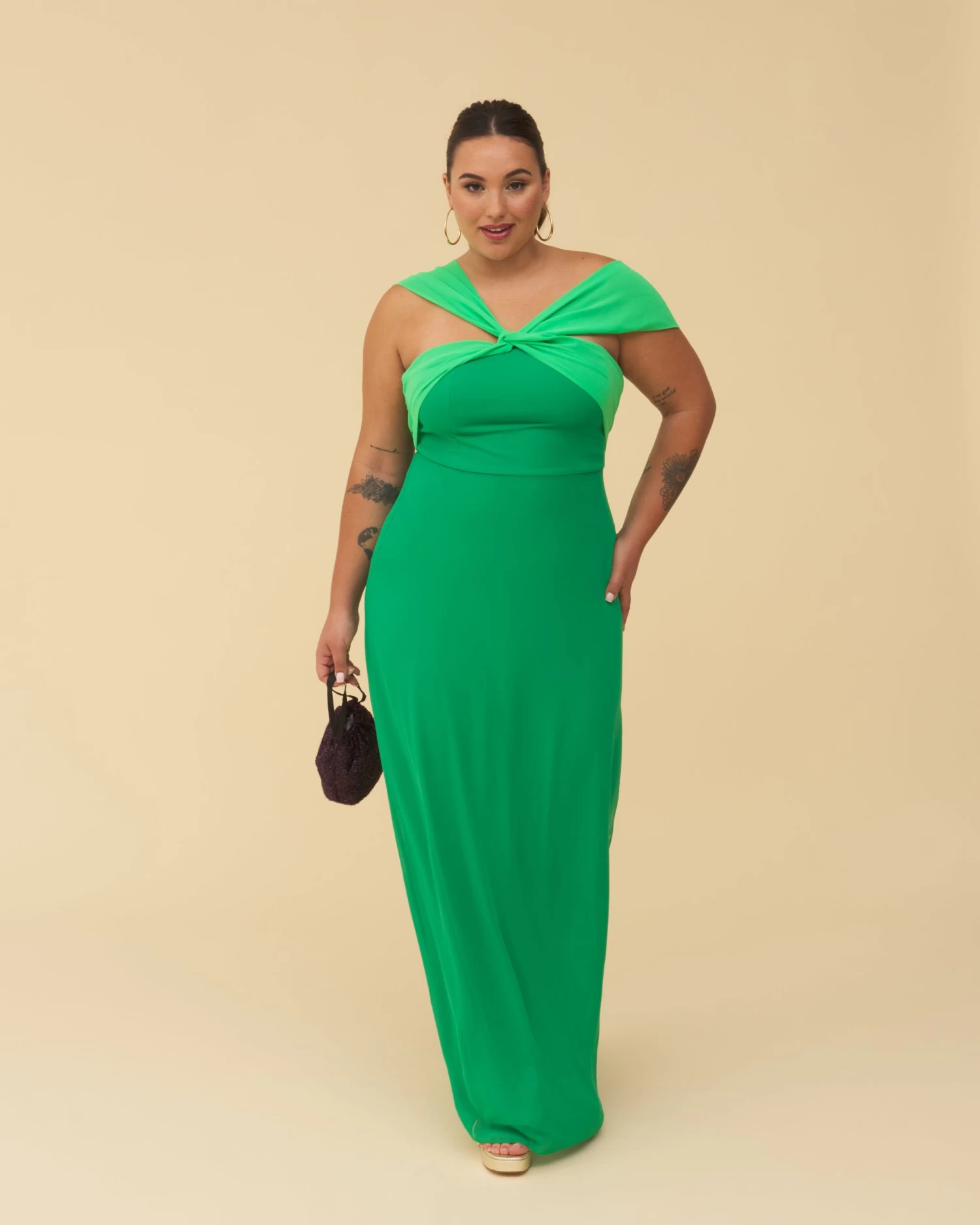 Vestido largo bicolor con escote bardot y detalle de nudo.