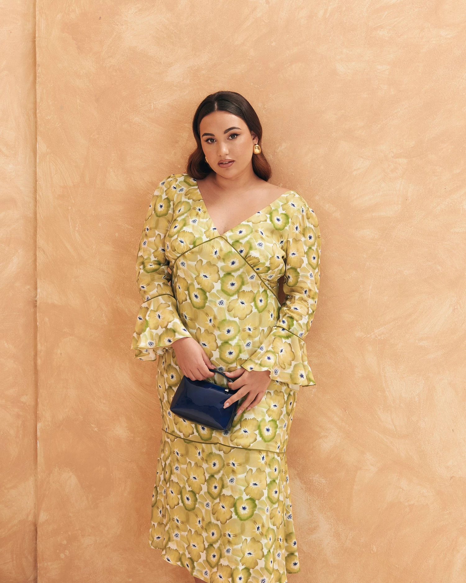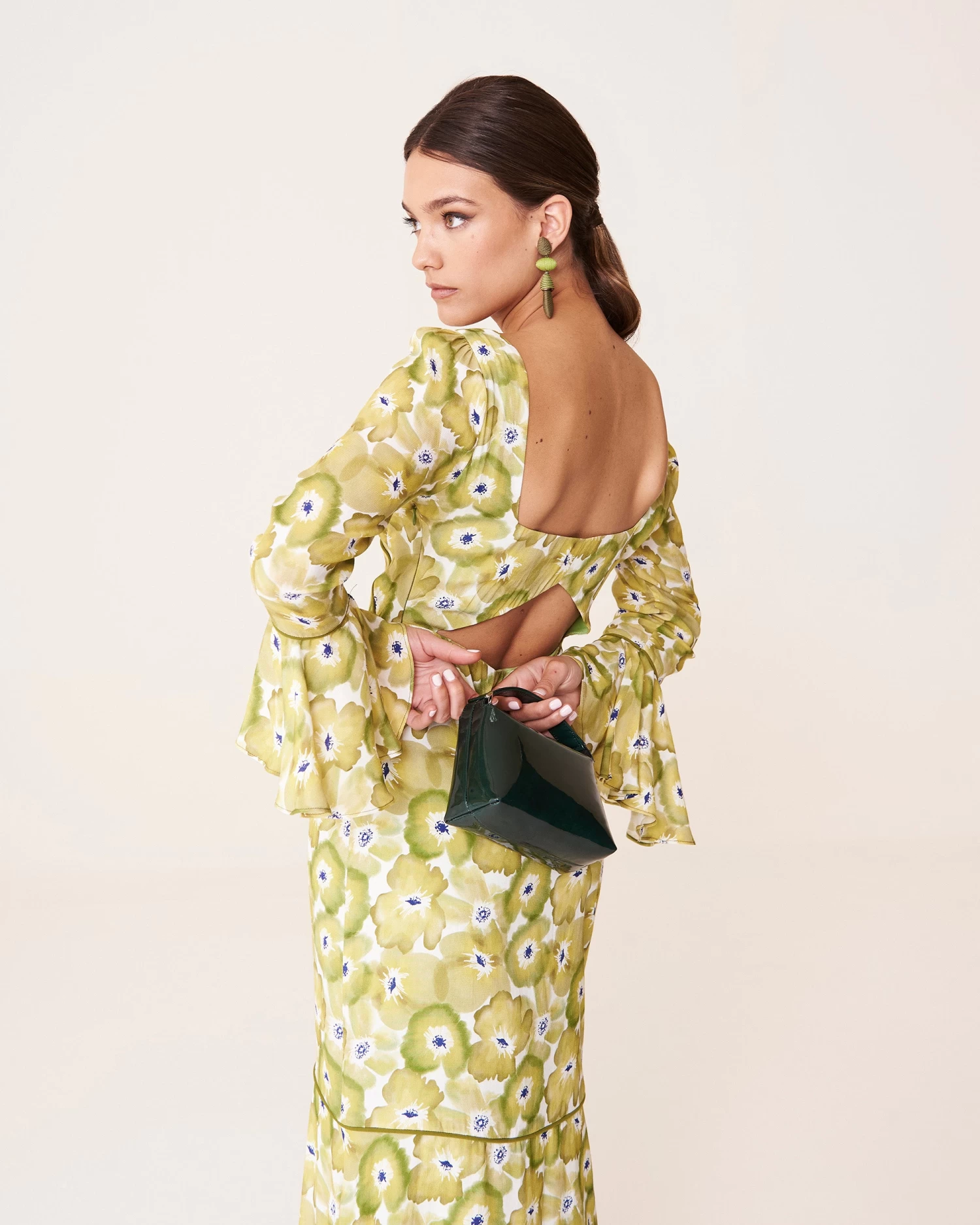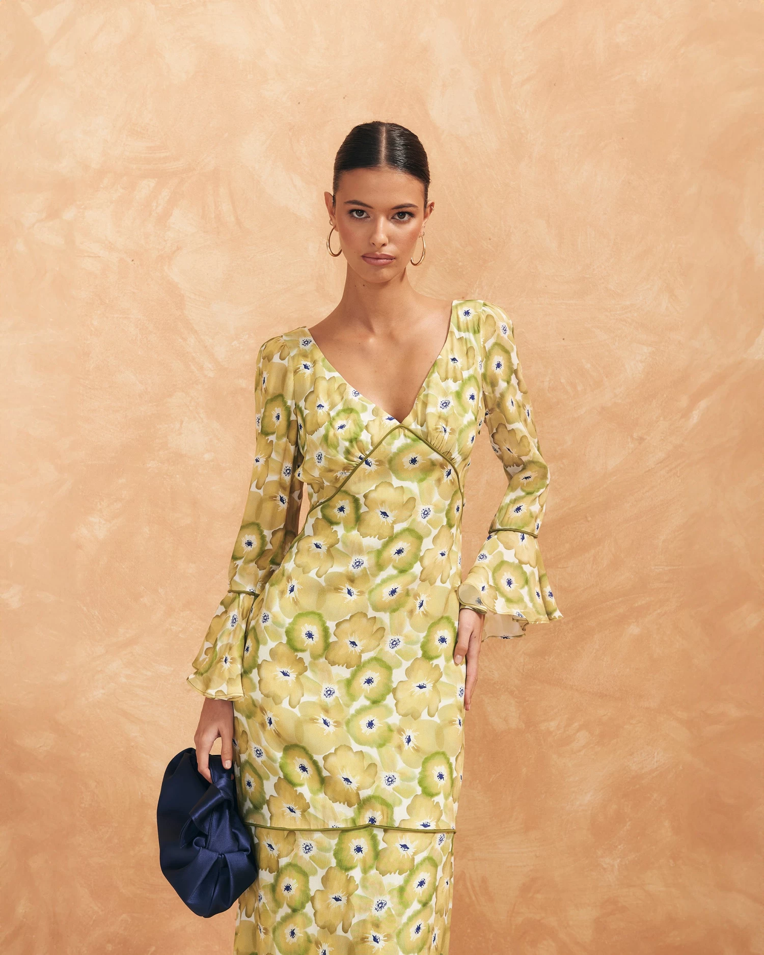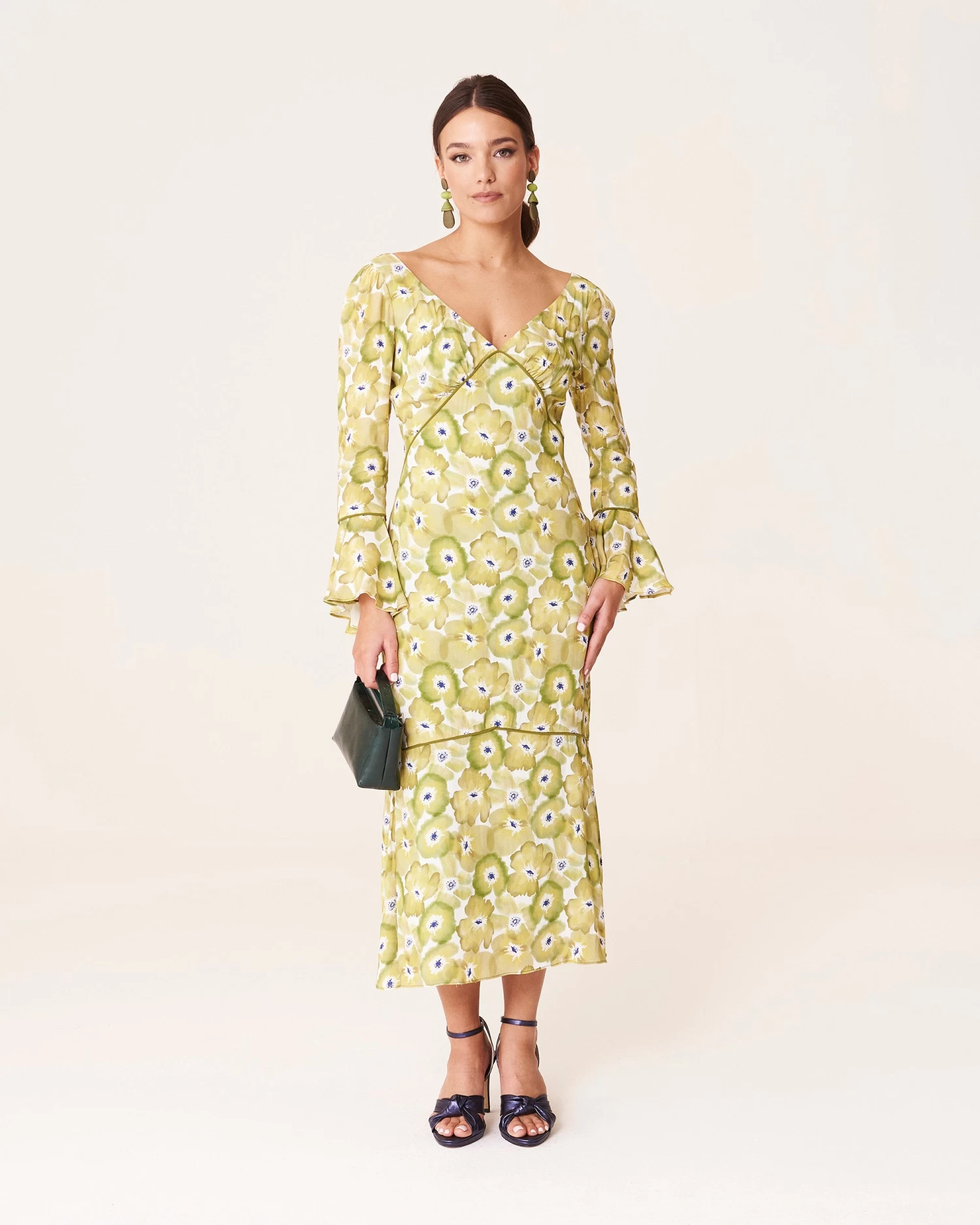 Vestido midi con escote en pico, volantes en las mangas y en el bajo para darle ligero movimiento y cut-out en la espalda.