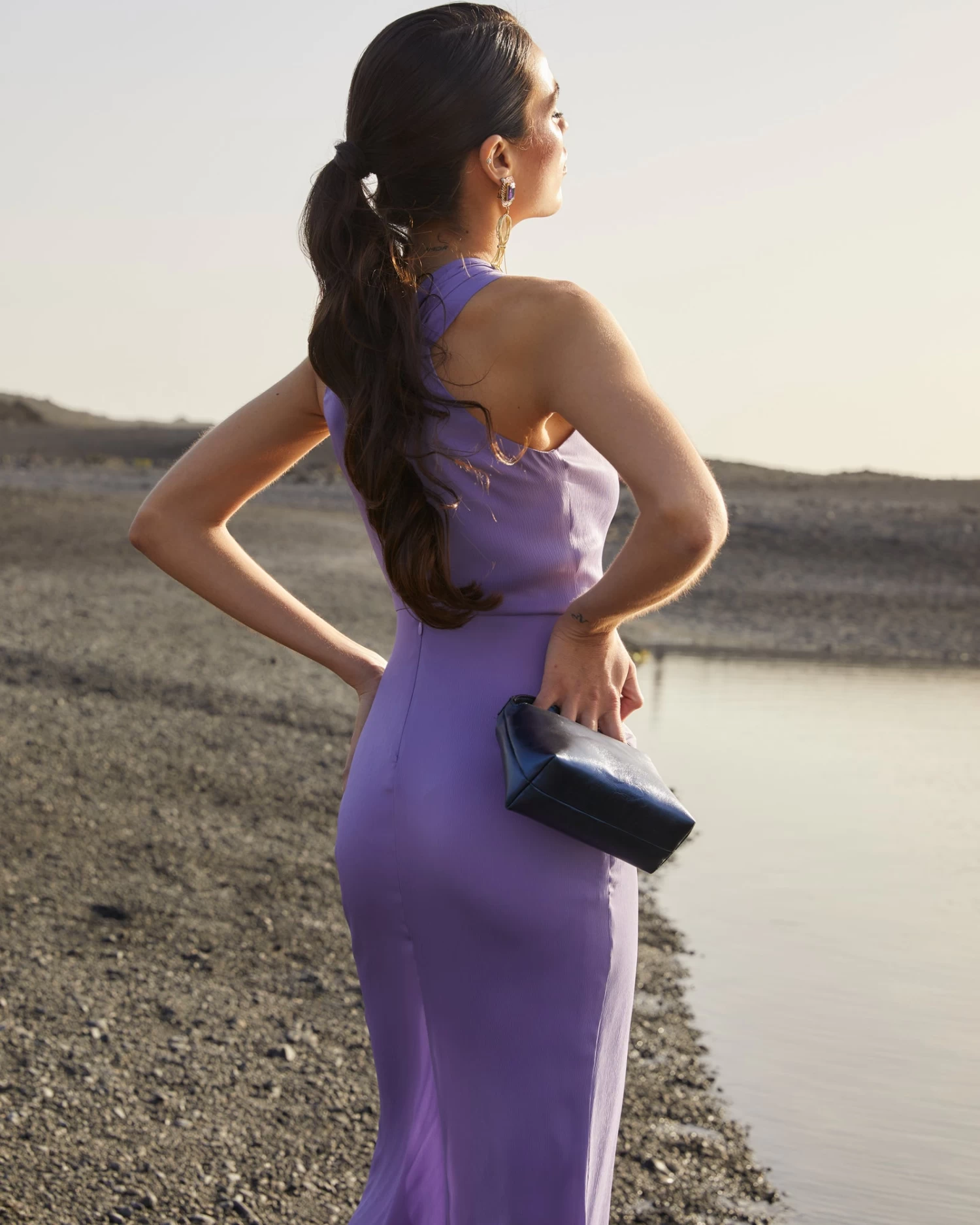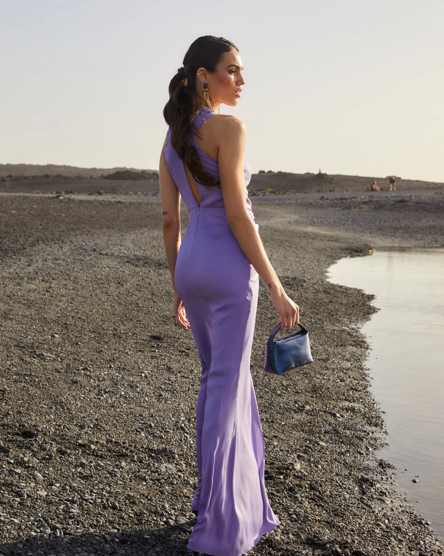 Vestido largo con cuello halter, abertura y frunces en la parte delantera y detalle de lágrima en la espalda.