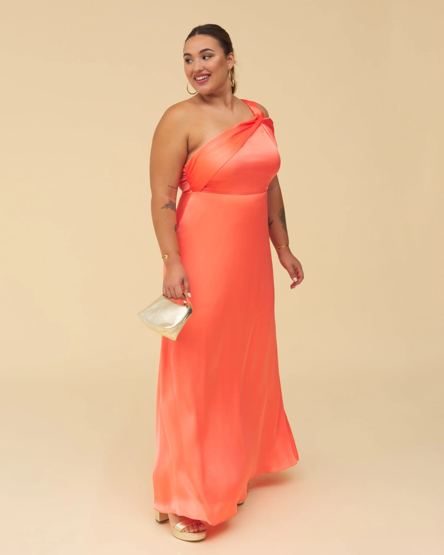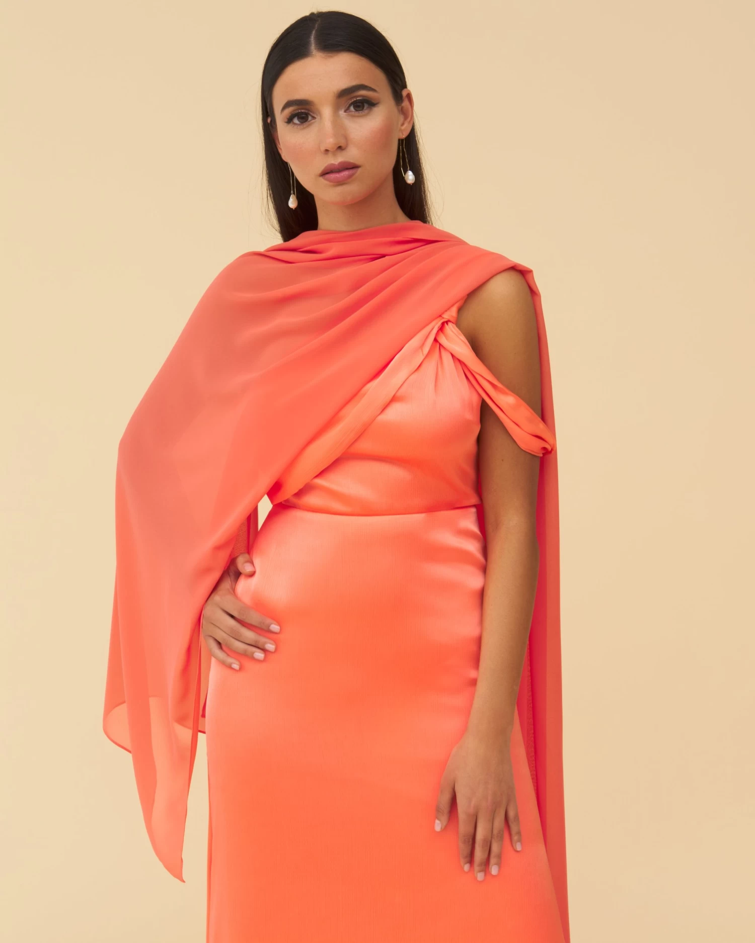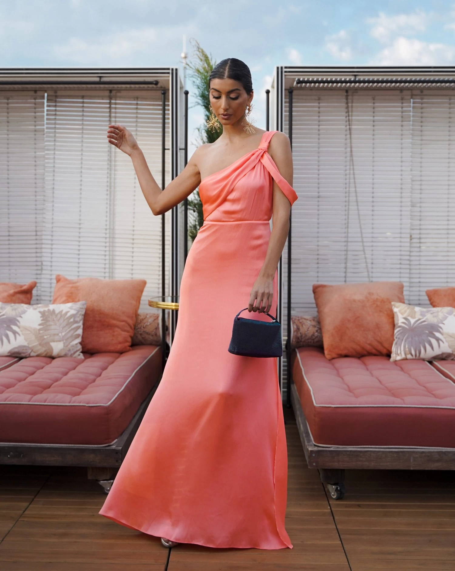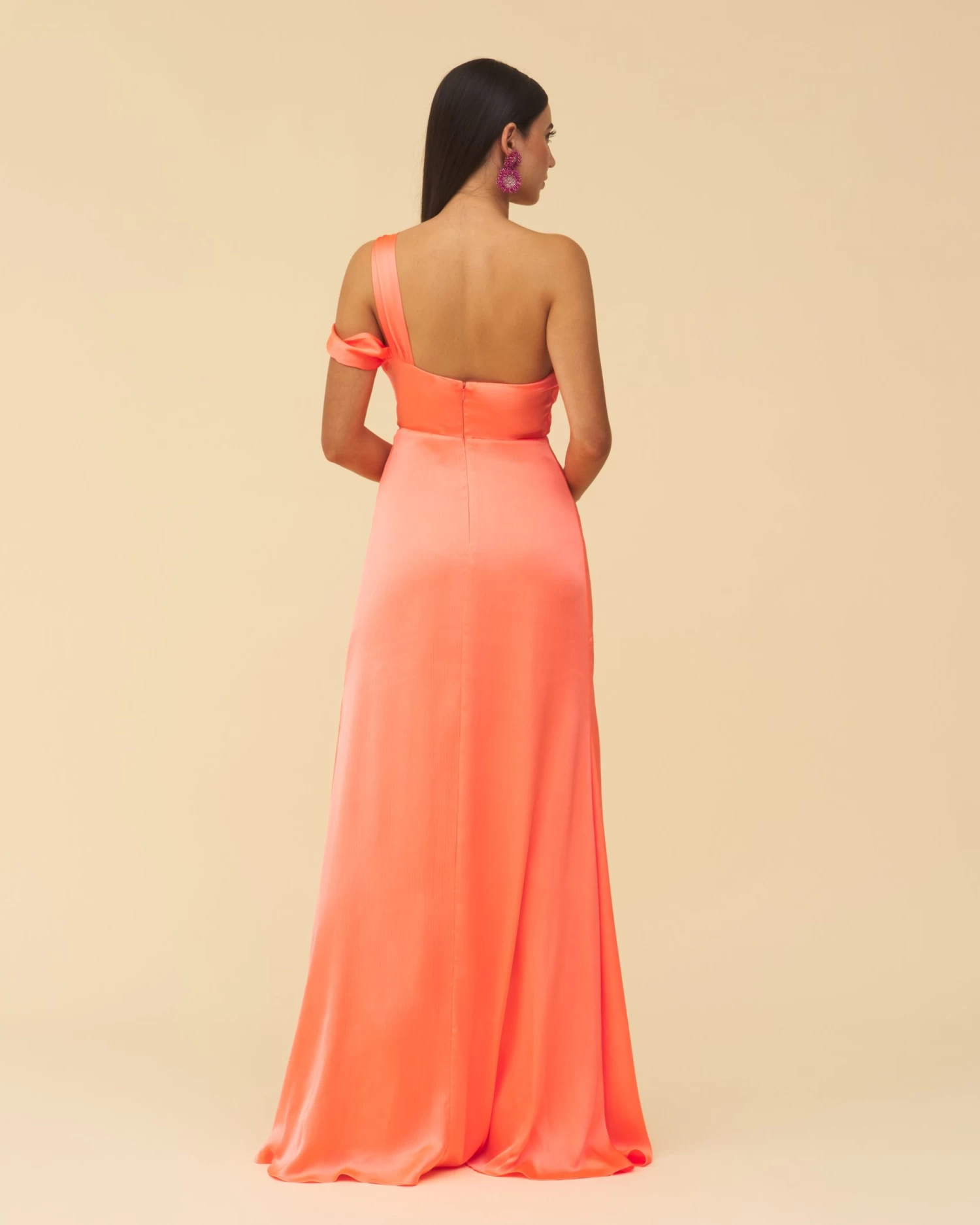 Vestido largo con escote asimétrico y abertura en el lateral.